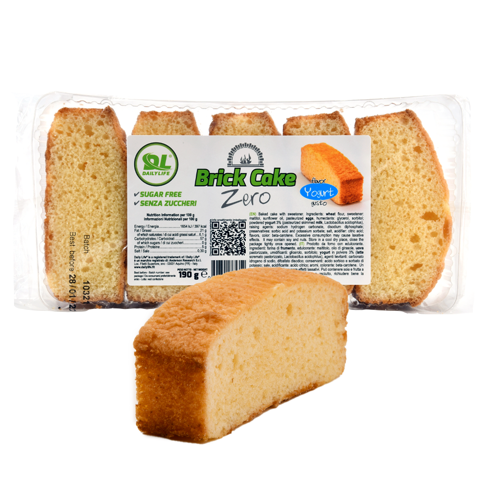 BRICK CAKE ZERO YOGURT 190G di DAILYLIFE è un prodotto di pasticceria, senza zuccheri aggiunti e senza olio di palma.