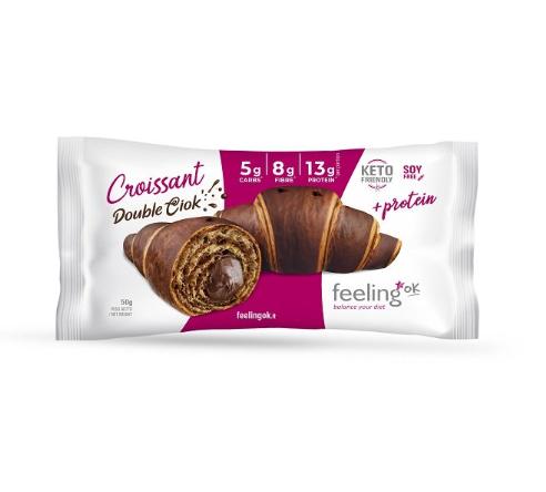 CROISSANT DOUBLE CIOK 50G di FEELING OK è uno squisito cornetto variegato al cacao con ripieno di crema proteica al cacao, povero di carboidrati e con ben 13g Proteine.