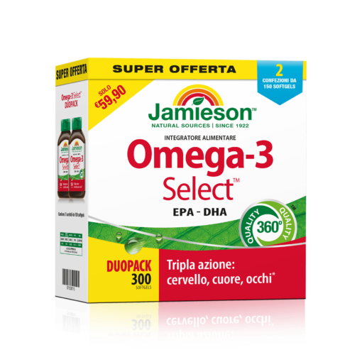 Duopack 2 Confezioni Omega 3 Select 150 Perle di JAMIESON è un integratore alimentare a base di Omega 3 acquistabile nel suo formato convenienza da 300 softgel.