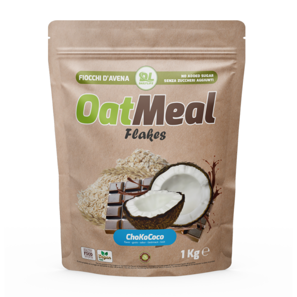 Fiocchi D'avena 1kg Cioccolato e Cocco di DAILYLIFE sono fiocchi di avena naturali aromatizzati al gusto di cioccolato e cocco.