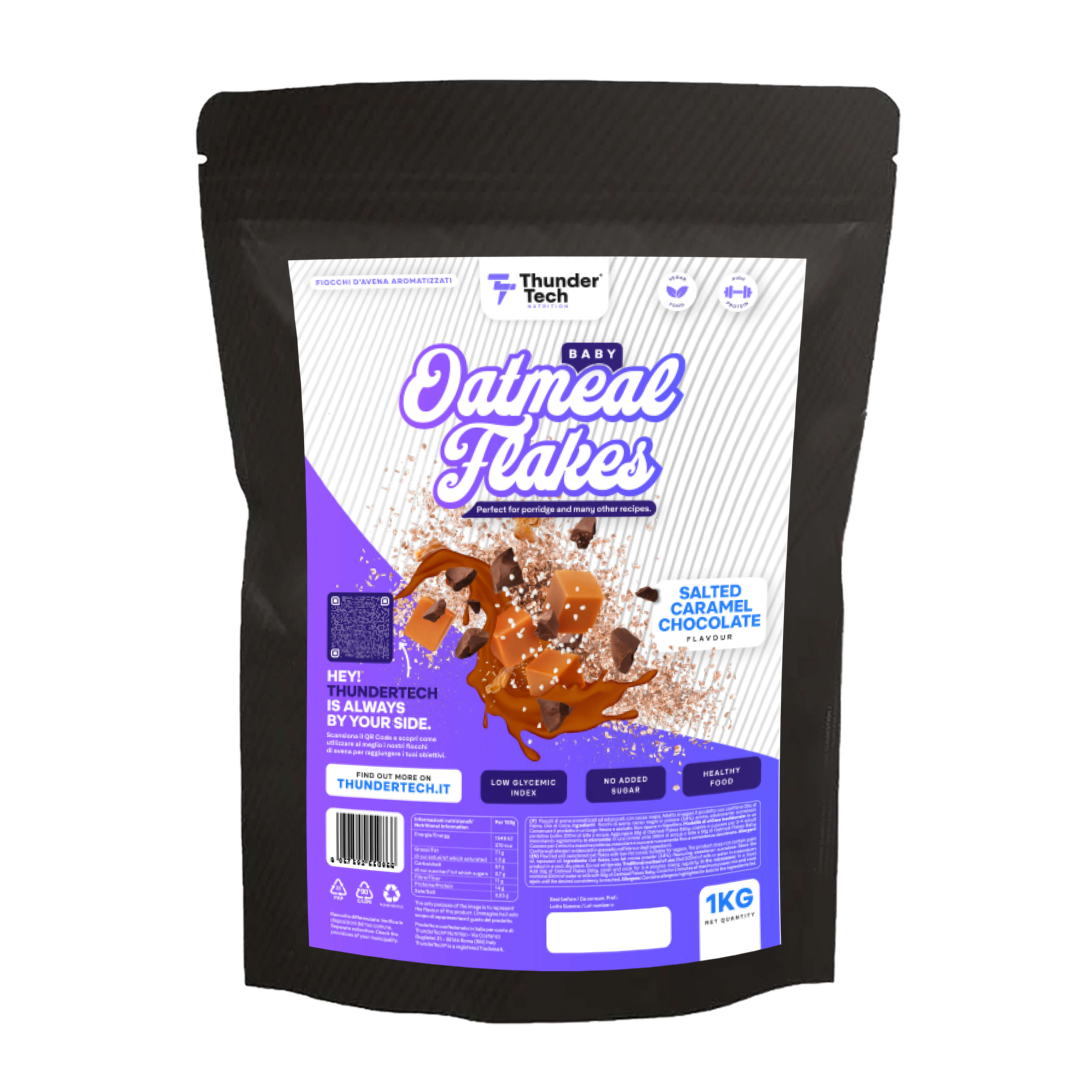 I Baby OatMeal Flakes 1kg di ThunderTech Nutrition al gusto Salted Caramel Chocolate sono dei fiocchi 100% d'avena baby aromatizzati della massima qualità, prodotti al 100% in Italia e certificati Vegan - Lactose Free - Senza Zuccheri Aggiunti.