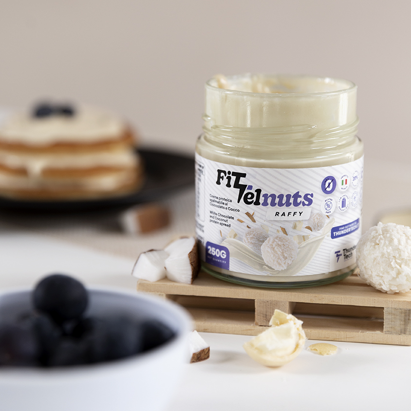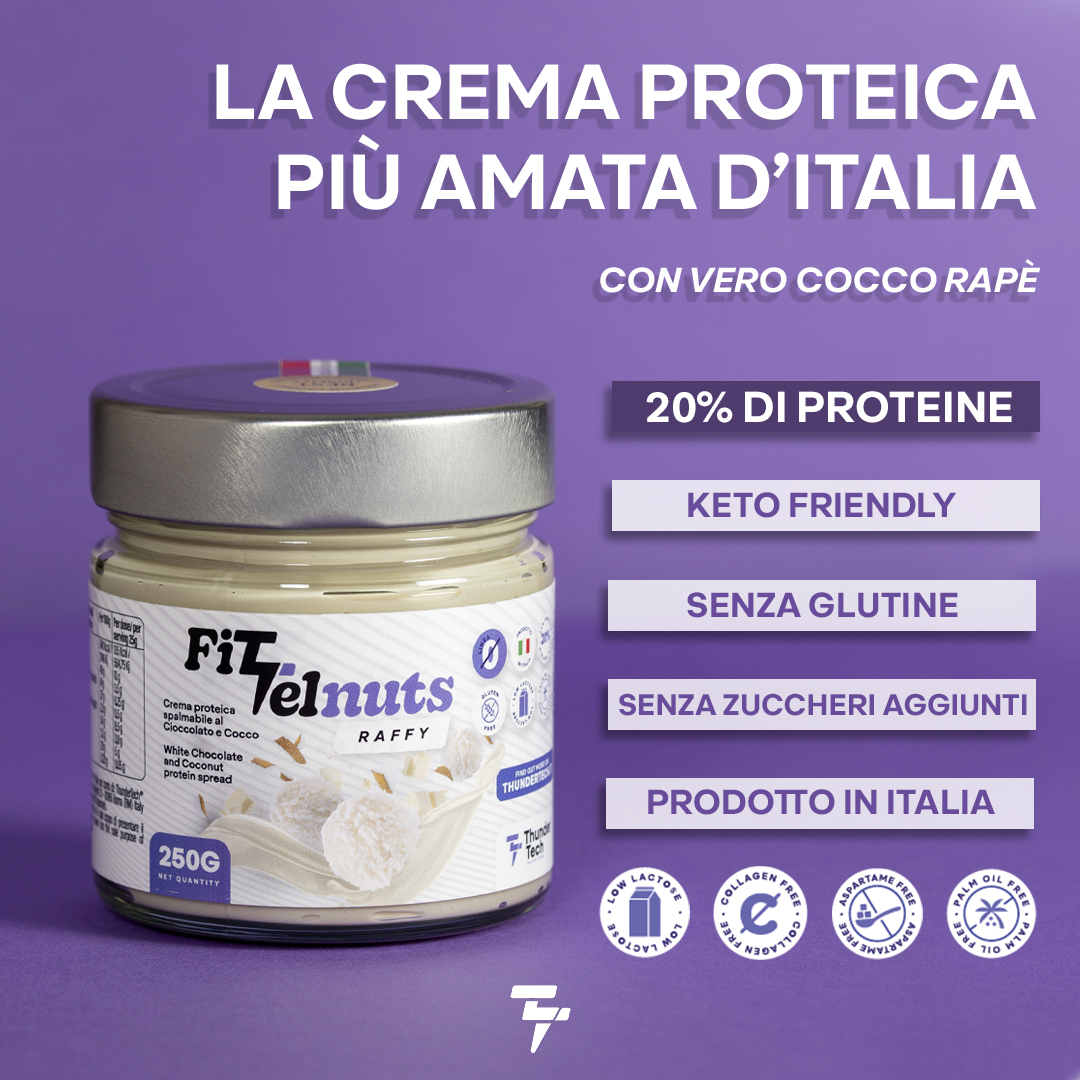 FITTELNUTS RAFFY 250G è l'incredibile crema spalmabile targata Thunder Tech Nutrition con il 20% di proteine del siero del latte, senza glutine e low lactose che ti farà tornare bambino!