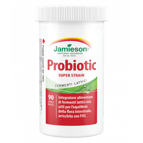 PROBIOTIC SUPER STRAIN 90 CAPS di JAMIESON è un integratore alimentare di fermenti lattici vivi (probiotici), utili per favorire l’equilibrio della flora batterica intestinale ed inulina (FOS), un oligosaccaride che funge da fibra, in quanto non assimilabile dall’organismo.